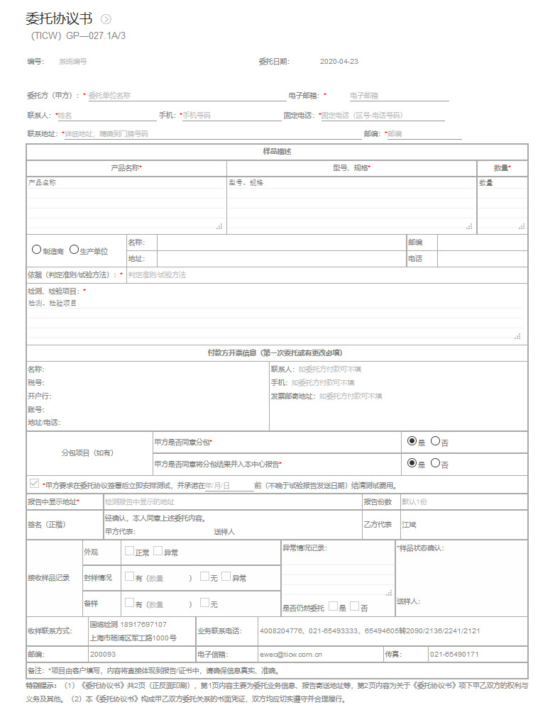 1、Party A shall be responsible for the correctness, authenticity, integrity and legality of the entrusted information and samples provided, and the samples provided shall meet the inspection and testing requirements. In case of any loss caused by false, misleading, concealment or major omission in the materials provided by Party A, Party A shall bear all responsibilities.